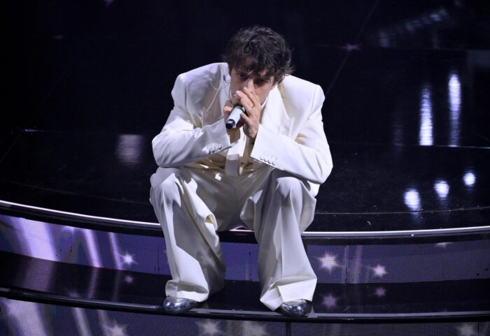 SANGIOVANNI: GCDS ha investito in San Giovanni con un total white e non poteva fare scelta migliore. Outfit che rappresenta il giovane cantane: eleganza e freschezza.