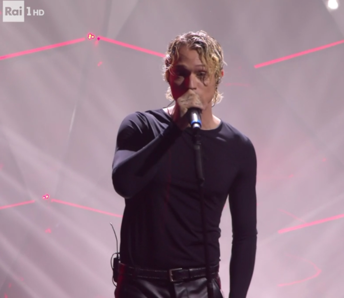 IRAMA: Sale sul palco con un total black tipico del personaggio. A dominare la sua performance il brano più che l’outift.