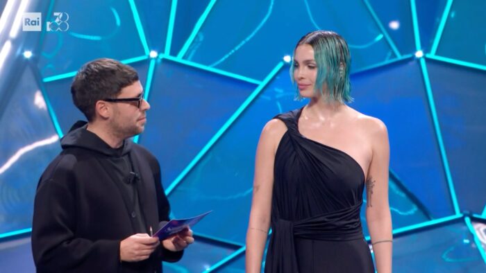 ANGELINA MANGO: Un coordinato che stupisce e ci piace. Un look giovanile che le si addice e si lega bene al brano cantato. Angelina è completamente a suo agio e domina il palco con grinta ed energia e il pubblico apprezza.