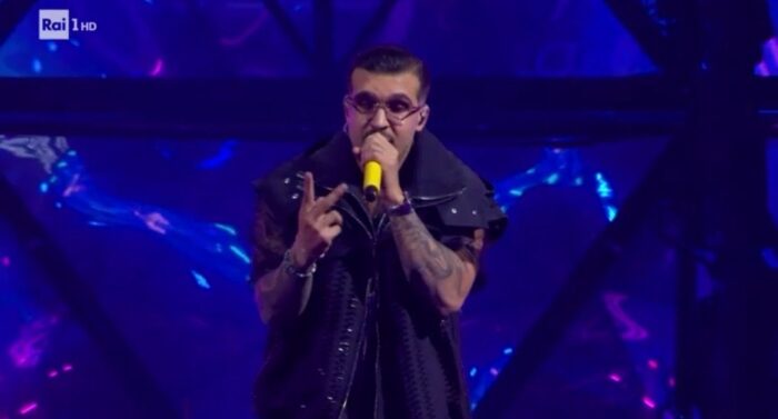 GEOLIER: La stylist Andrea Amara ha scelto per l’artista uno smanicato cosparso di brillantini che va a coprire una t-shirt velata tutto su i toni del nero. Outfit che rispecchia lo stile di Geolier, ma non adatto a un palco del genere.