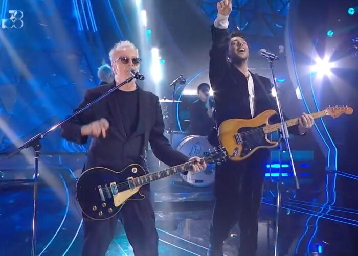 Rose Villain con Gianna Nannini: Che bel duo possiamo dirlo? Rose Villain e Gianna Nannini, così diverse ma così ipnotiche. La Villain indossa un bel vestitino bianco ricoperto di strass accompagnato da lunghi guanti, stile anni 80. Gianna è Gianna, con questo completo che rispecchia il suo stile in pieno, due donne forti che hanno catturato l’attenzione di tutti.