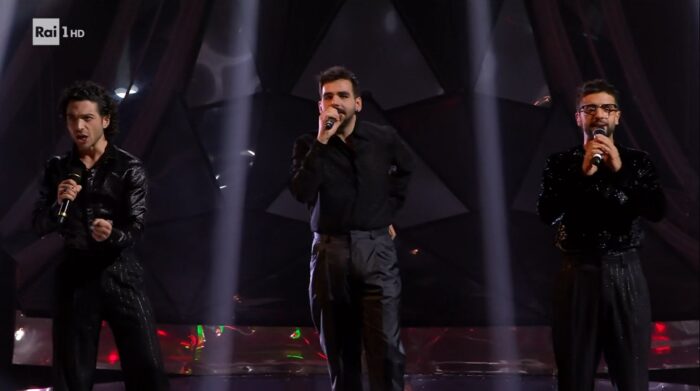Il Volo con Stef Burns: L’onda del nero continua e ha davvero annoiato. Il Volo in questa esibizione ‘colpiscono’ solo perchè sono accompagnati da Stef Burns, storico chitarrista di Vasco Rossi, con un look da vero musicista rock. Punti positivi non ne troviamo: completi sul nero, ovviamente, e brillantini.