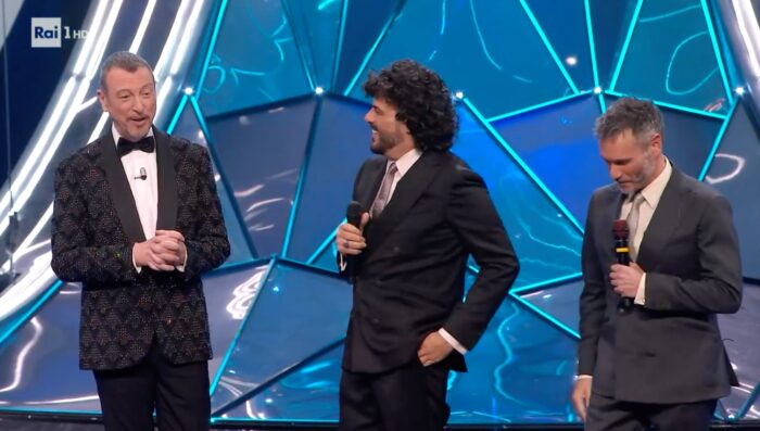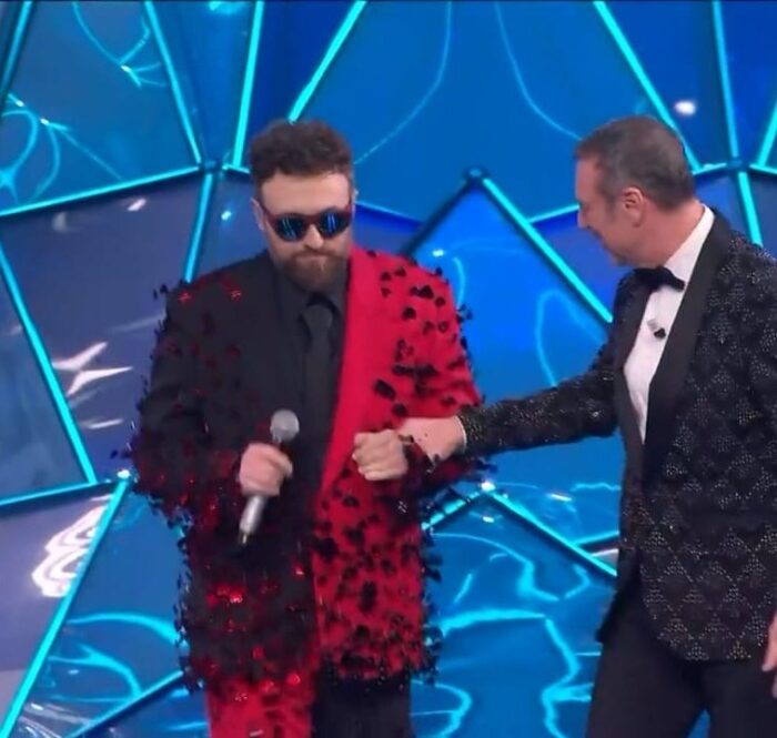 DARGEN D’AMICO: Strass ovunque, Dargen D’Amico osa alla grande. Torna il rosso sul palco, ma solo per metà. Ricorda un Mon Chéri, dolce e forte allo stesso tempo.