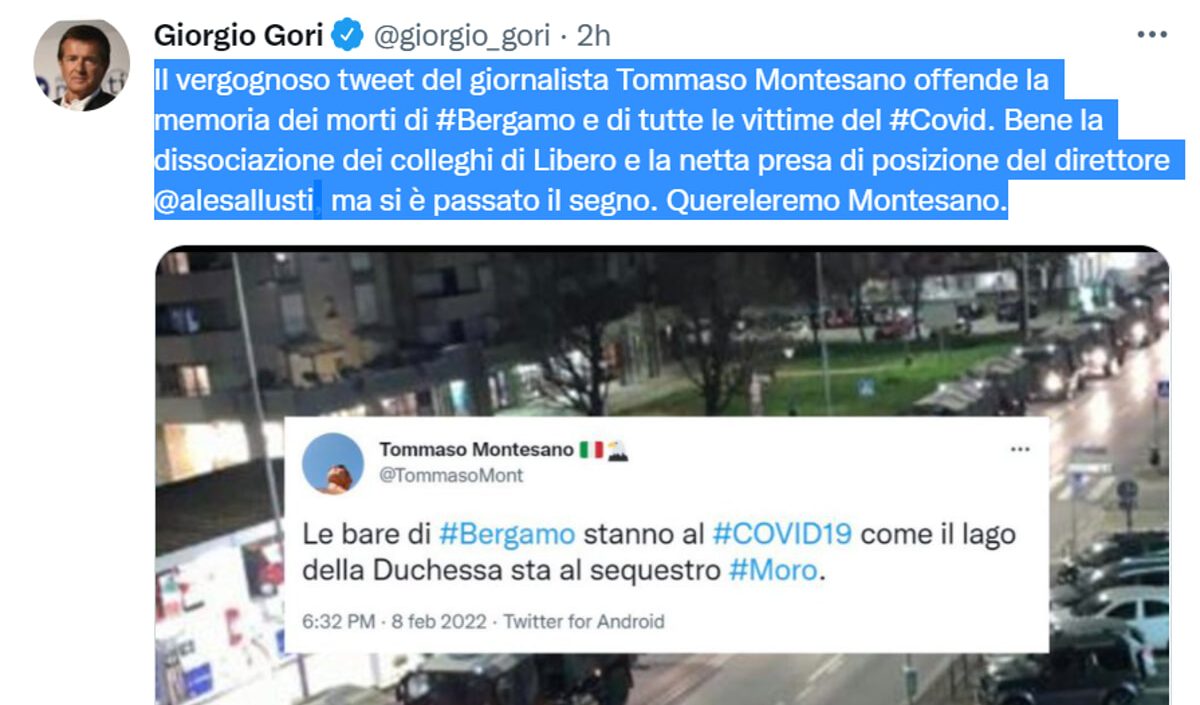 Dopo il tweet negazionista di martedì di Tommaso Montesano, i familiari delle persone morte per Covid che avevano i loro cari nelle bare sui camion di Bergamo lo hanno querelato per “il gravissimo vilipendio alla memoria e alla dignità di migliaia di vittime”.