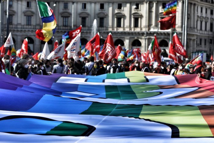 Alla testa del corteo, partito da Piazza della Repubblica, una lunga bandiera con l’arcobaleno della pace, retta dai manifestanti. “Siamo più di 50 mila”, hanno annunciato dal palco gli organizzatori.