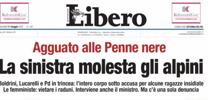 Il titolo di Libero è la degna continuazione della imbarazzante nota della Lega di ieri: “La sinistra molesta gli alpini”, agguato alle penne nere. Ossia Un rovesciamento della realtà. E anche un tentativo maldestro di minimizzare la vicenda.