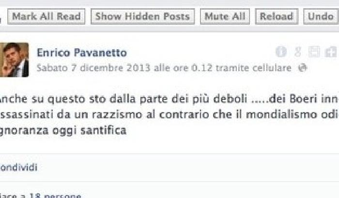 La scomparsa di Mandela è stata un grande lutto per molti, ma non per tutti. Infatti c’è chi l’ha accolta in maniera diversa come l’assessore provinciale di Padova, Enrico Pavanetto, che ha postato sul suo profilo Facebook questa frase: «Anche su questo sto dalla parte dei più deboli …..dei Boeri innocenti assassinati da un razzismo al contrario che il mondialismo odierno e l’ignoranza oggi santifica».