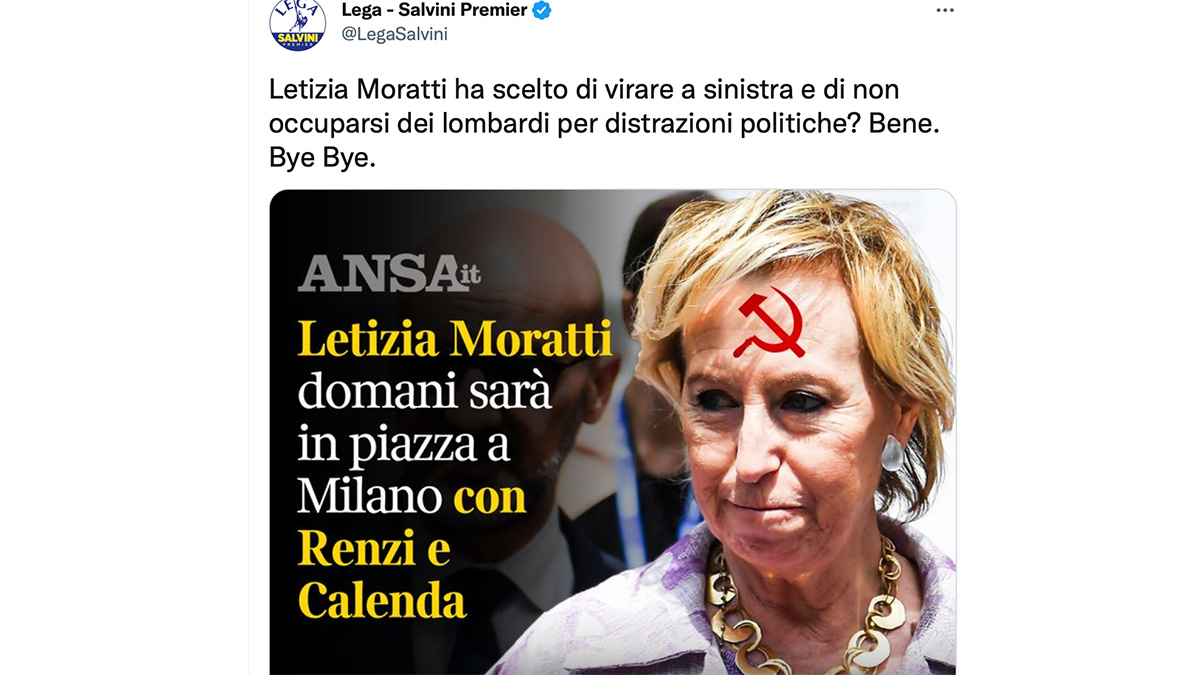 Con un orrendo post su twitter, il profilo ufficiale della Lega – Salvini Premier, ha pubblicato una foto di Letizia Moratti con una falce e martello rossa disegnata in testa, quasi fosse un marchio d’infamia.