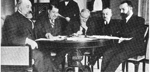 La delegazione turca e italiana a Losanna: Pietro Bertolini, Mèhemmed Naby Bey, Guido Fusinato, Roumbeyoglu Faheddin, Giuseppe Volpi (immagine Wikipedia)