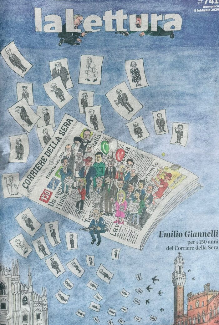 Emilio Giannelli si avvicina ai novant’anni con lo stesso sguardo curioso con cui, a soli cinque anni, disegnava la prima caricatura dedicata a Vittorio Emanuele III. La Lettura (inserto domenicale del Corriere della Sera) in occasione dei 150 anni del quotidiano di Via Solferino gli dedica una copertina e un racconto stimolato dalle domande di Paolo Conti. Insieme al compleanno Emilio Giannelli festeggerà i trentacinque anni di vignette in prima pagina al Corriere della Sera. Un traguardo che lo rende orgoglioso, anche perché mai avrebbe immaginato di approdare al giornale più autorevole d’Italia.