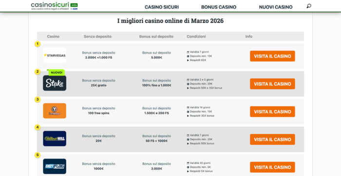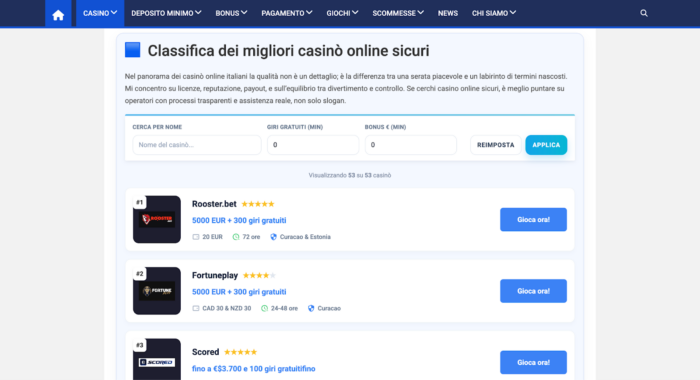 Casinosicuri.info si concentra principalmente su siti di casinò esteri per gli italiani con licenza ADM, legali in Italia secondo la normativa vigente. Il portale, con sede a Brescia, analizza il deposito minimo (che parte da 5€ fino a 20€), la presenza di bonus trasparenti e la qualità dell’interfaccia utente. Dopo averlo messo alla prova, si nota che il sito offre comparazioni pratiche tra promozioni di benvenuto, utili per chi vuole valutare diversi operatori. I bonus casinò vengono valutati non solo per l’importo, ma soprattutto per i requisiti di scommessa e la chiarezza delle condizioni.