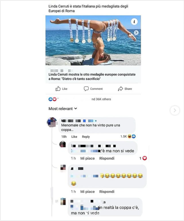 L’atleta azzurra aveva pubblicato una foto su Instagram in cui posava nella classica posizione del sincro, mentre mostrava ai suoi follower le otto medaglie conquistate a Roma nel corso degli Europei di nuoto, sei argenti e due bronzi. La foto, ripresa da diversi quotidiani e condivisa sui social, è stata sommersa di commenti sessisti.
