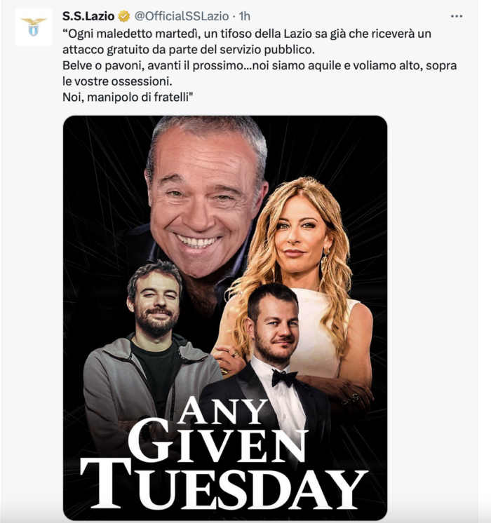 A corredo del messaggio sui social, la società biancoceleste ha pubblicato una foto con la scritta ‘Any given tuesday’ che ritrae gli stessi Amendola e Rapone insieme ai conduttori dei due programmi, Francesca Fagnani e Alessandro Cattelan.