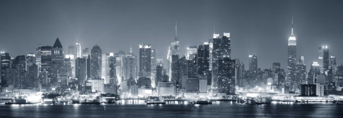 Skyline di New York di Manhattan in bianco e nero di notte con grattacieli illuminati sul fiume Hudson